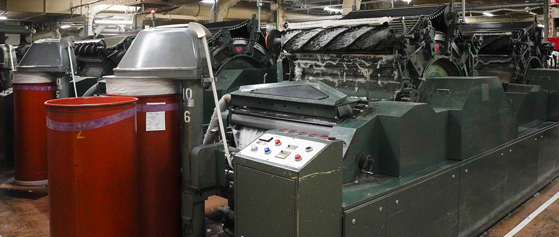 ナイガイテキスタイルではシングルカード機を縦連結したタンデムカード機を用い、二段構えで均斉度を高めることで、ムラの少ない高精度なスライバーを安定して作っているとのこと。