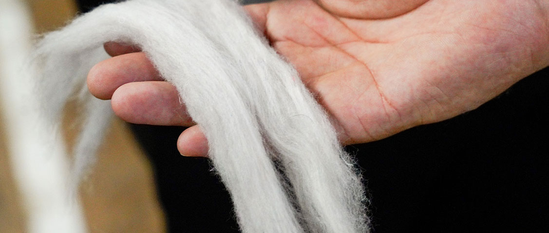 こちらが、出来上がったカードスライバー。なんとなく糸に近づいてきました。短い繊維が取り除かれ、強度のある糸が残ったロープ状の束になっています。