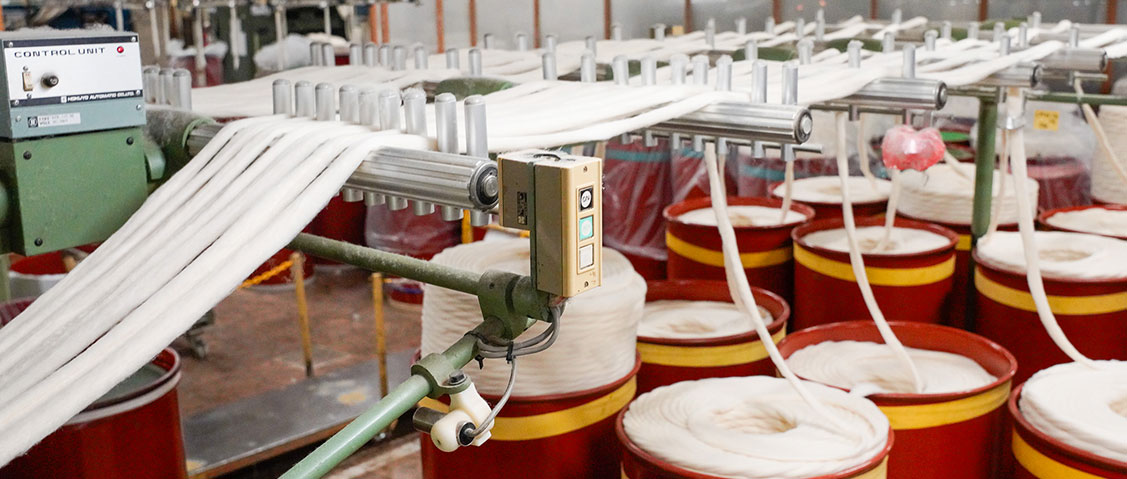 そもそも紡績とは、綿、麻、羊毛などの短繊維を加工して糸にする工程のことですが、一口に紡績といえど、その中には、繊維をほぐして方向をそろえ、引き伸ばしながら撚り(より)をかけるなど、いくつもの工程の積み重ねです。