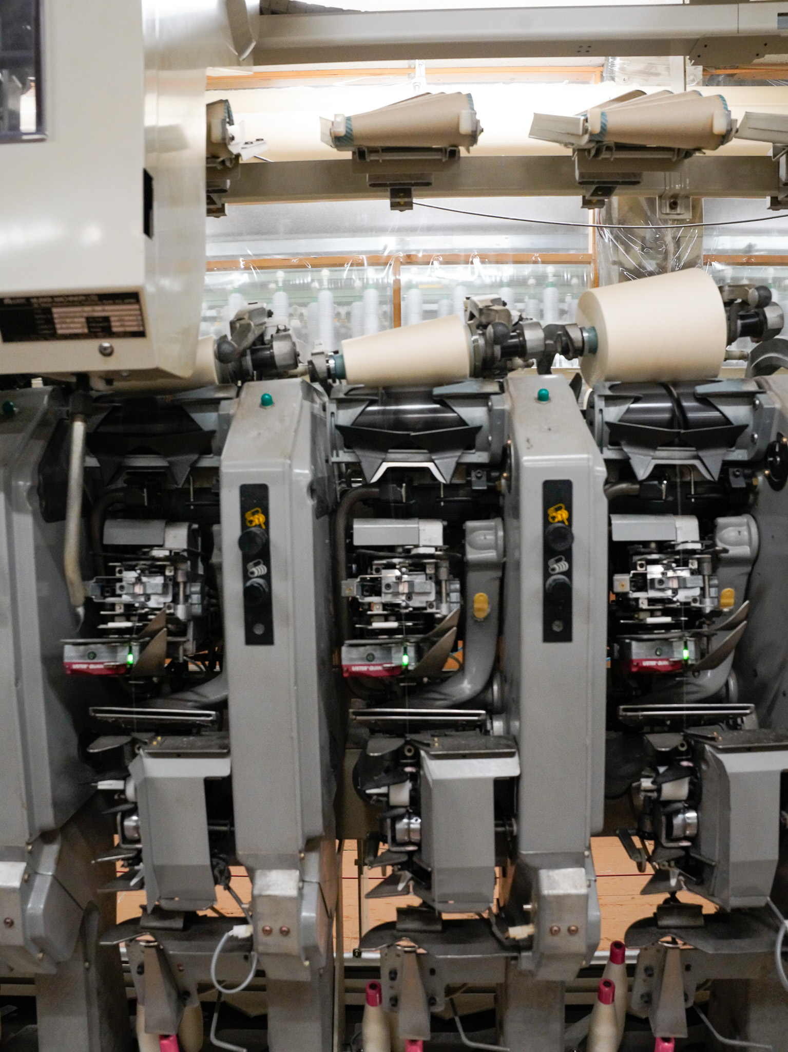 この大きな精紡機では、上段に粗糸をセットし、引き伸ばしながら撚りを与え、下段のボビンへ連続して巻き取っていきます。ずらりと並ぶ各スピンドルに細く均一な糸が次々と巻き上がっていきます。