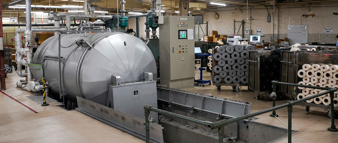 撚りの強い糸は、撚り戻りによるループ状の縮れが出やすくなります。そこで、ニット用の糸は編み機の通りをよくするため、軽く熱を加えて糸のクセを落ち着かせる処理を行います。