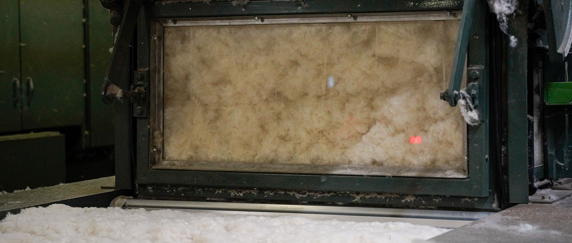 こうして空気を十分に含ませることで、原綿は約1.5〜2倍にふくらみ、次の工程で扱いやすい状態になります。