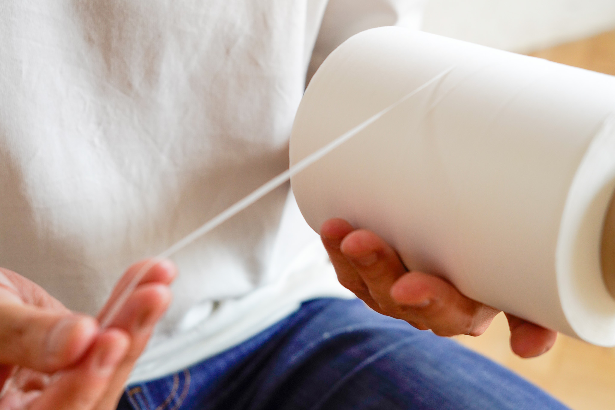 紙素材と聞くと、「洗うと水に溶けてしまうのでは?」と思われるかもしれませんが、その心配はありません。 和紙の糸は、シート状の和紙を細長くカットし、それを撚り合わせて作られています。 この工程で長い繊維同士がしっかりと絡み合うため、耐久性が高まり、引っ張りや摩擦にも強くなります。 そのため、生地に仕立てても毛玉ができにくく、長く着用できる丈夫なものに仕上がるのです。