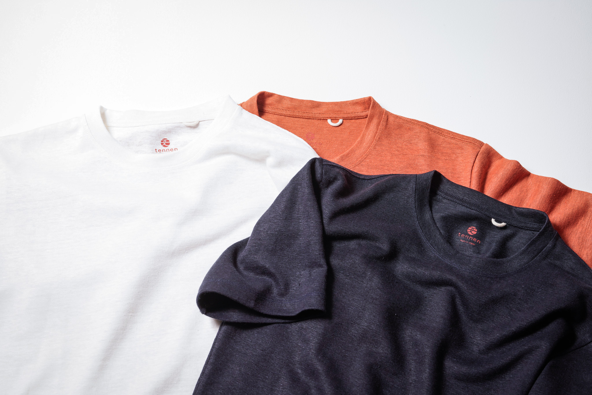 協力工場の技術開発により、しなやかな天竺生地に仕上げられたtennen のヘンプT シャツ。編み物ならではの伸縮性と優しい肌触りを保ちながら、素材由来のシャリ感も両立。肌ばなれもよく、ヘンプ繊維特有の多孔質構造により熱や湿気がこもりにくいのも特徴です。暑い夏も快適に涼しく過ごせます。