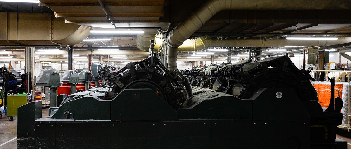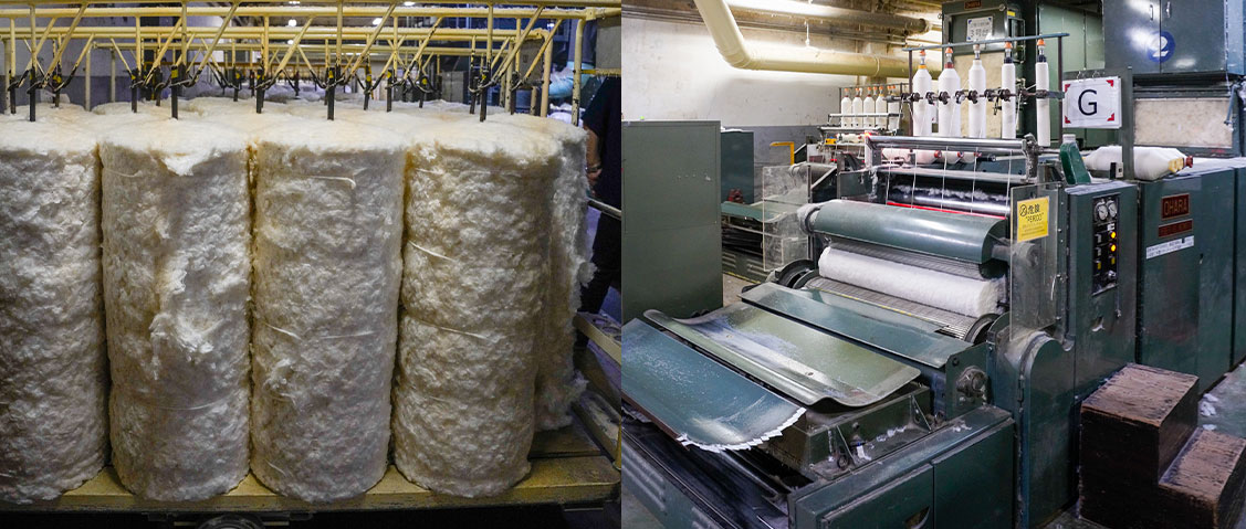 ムラなく混ぜ合わされた原料は、再び混打綿機を通してラップに整えられ、続いてカーディング工程へ進みます。