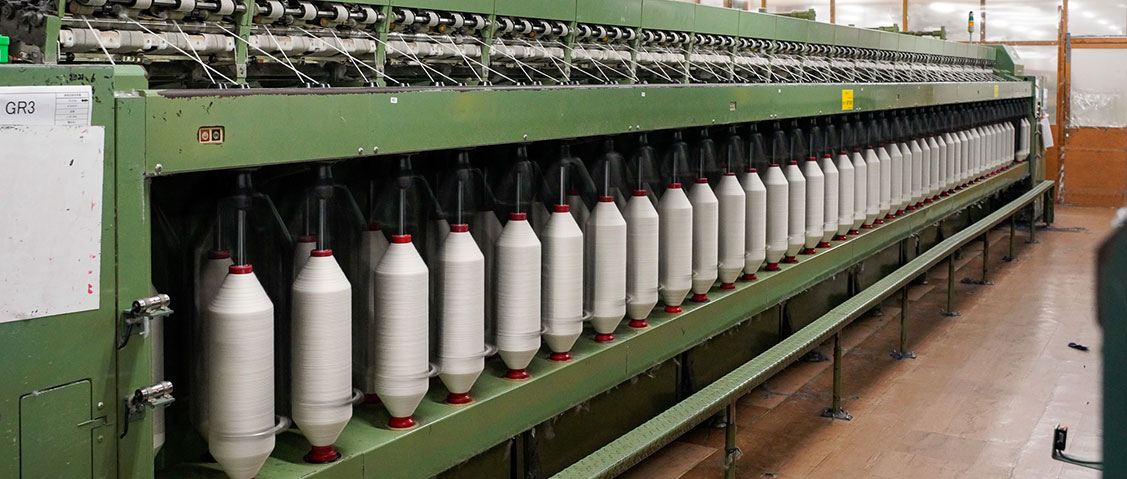 紡績の主要工程の締めくくりです。粗紡で得た粗糸を引き伸ばし、所定の太さまで細くしながら、同時に必要な撚りを与えます。こうして糸としての形に仕上げたものをボビンに連続巻き取りし、次工程へ受け渡します。