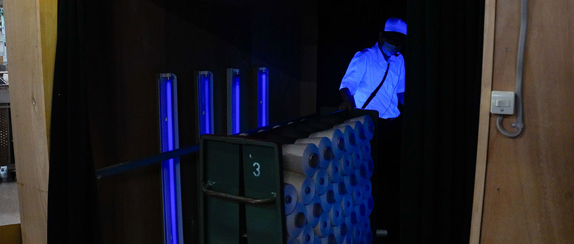 完成したコーンをキャスター台に載せ、ブラックライトを照射して品質のムラや、意図しない異種の糸の混入をチェック。センサーの検知結果と目視確認を突き合わせ、規格外はその場で除去、仕分けします。