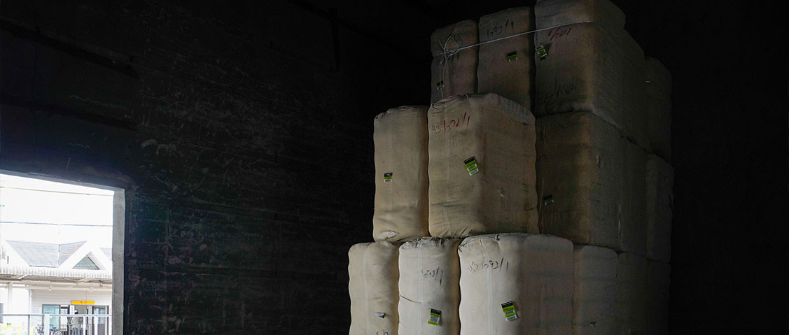 綿花は圧縮梱包の状態で工場に届き、1梱包は約220kg。広い倉庫にはたくさんの素材が保管されていました。