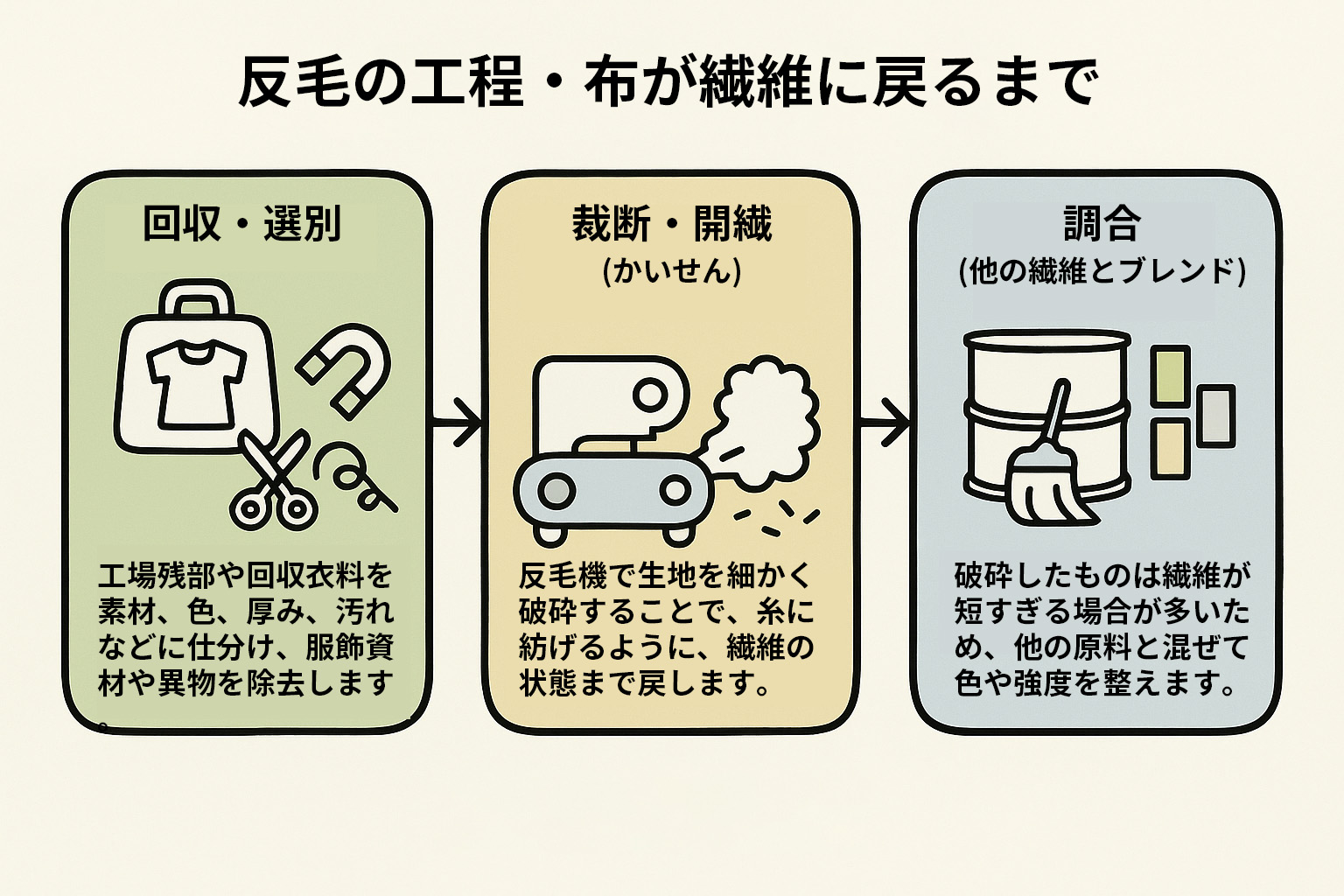 繊維リサイクルには大きく、①マテリアルリサイクル(素材のまま再資源化)、②ケミカルリサイクル(化学的に分解して再生)、③サーマルリサイクル(焼却して熱回収)の三種があります。私たちが採用しているのは①のマテリアルリサイクルです。