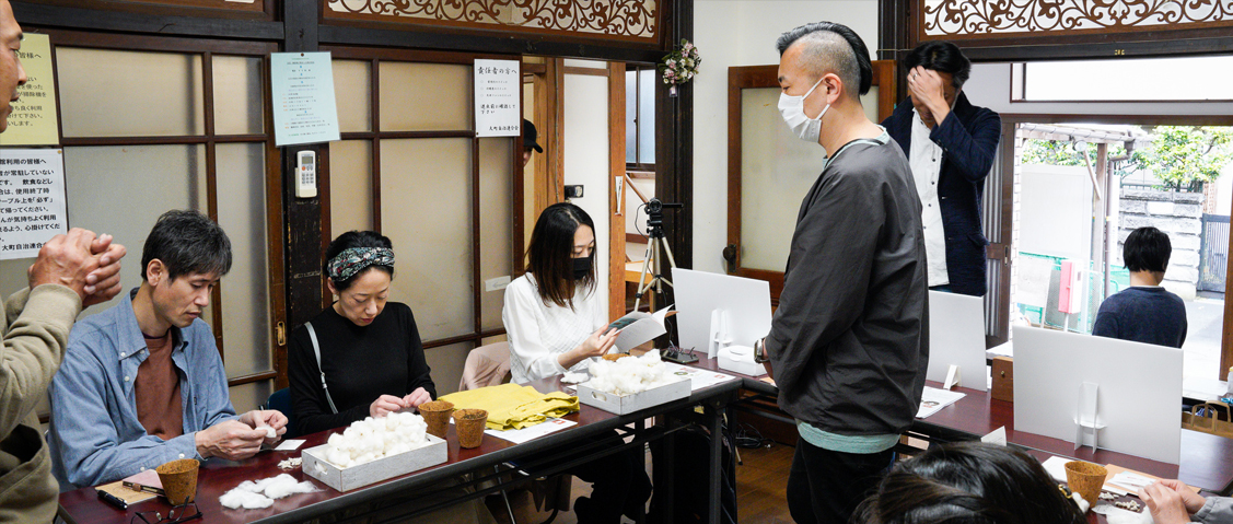 そんなこんなで決定したtennenのワークショップ。会場は鎌倉市大町にある昔ながらの公民館で、そんなに大きなスペースではありませんが、最初から最後まで満席状態で、みなさん興味津々にワタから種を取り出していました。