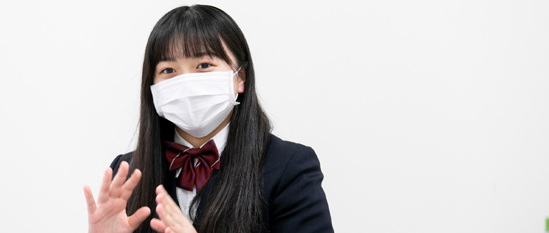 学科は「i グローバル部」と「キャリア部」の大きく二つに分かれていて、鈴木さんはキャリア部に在籍し、その中で進学教養というコースを専攻。彼女たちが受けているカリキュラムの中には、「総合的な探究」の一貫として「考える科」という同校オリジナル科目の授業があるそうです。