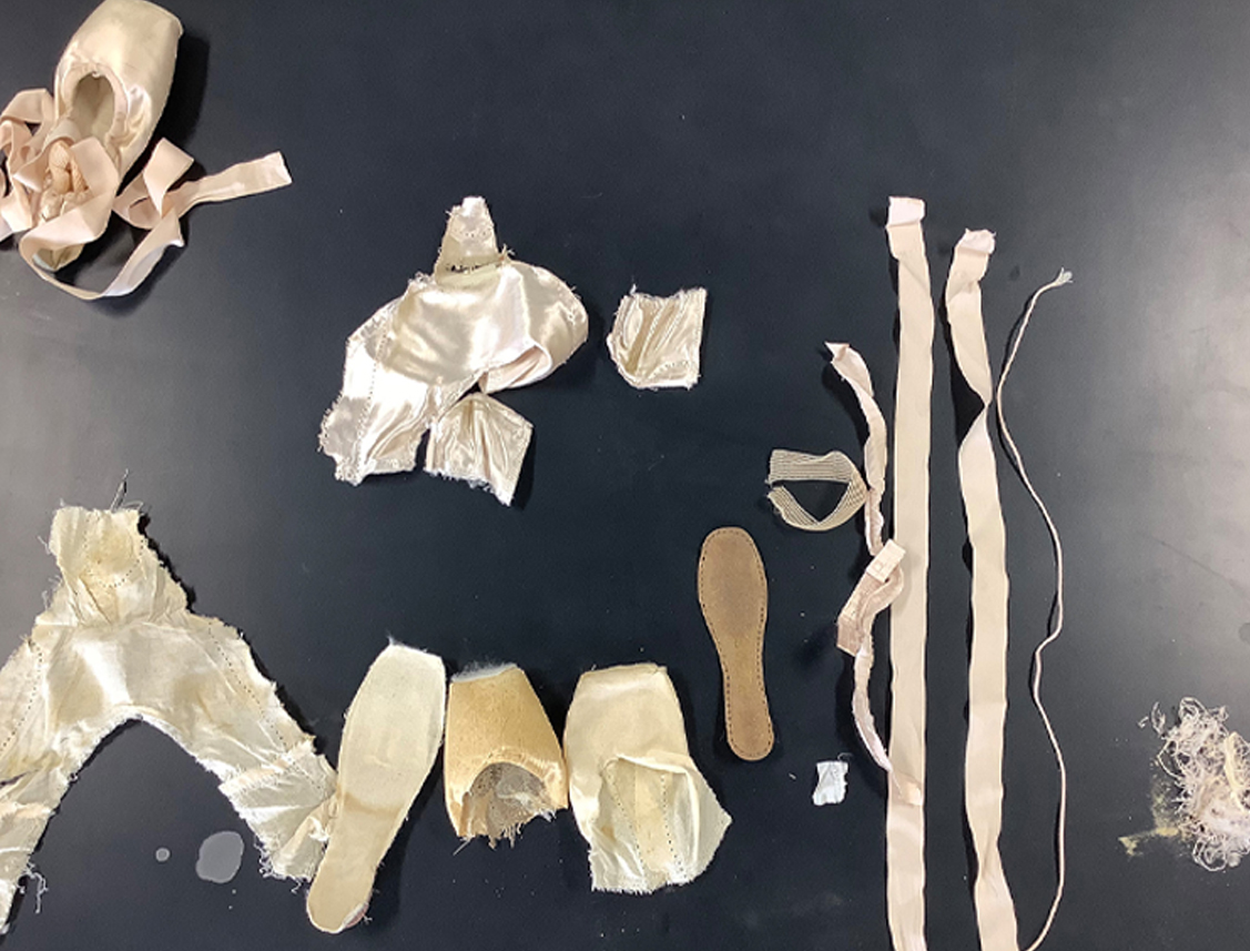 まず始めに行ったのは、トゥシューズの解体。今の時代なんでも検索窓にワードを入れて解決しようとしてしまいがちですが、自分でどんな構造になっているのか調べることは自分の手を使ってみたといいます。