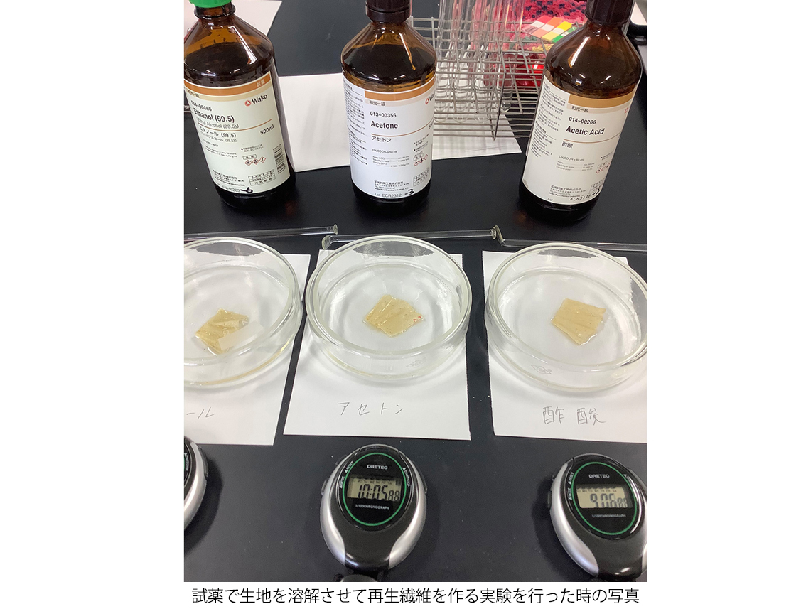 「繊維リサイクルというところでいうと、化学繊維のリサイクルは繊維を溶かすなどして行われていますが、とりあえず出来ることからでもやってみようと帆布の部分のリサイクルをしてみました。綿からは再生繊維であるキュプラができるということを知って、じゃあその過程を実際に試してみようと先生に手伝っていただいたのですが、それもとても大変で。実際に私が使い終わったシューズから生地を取り出し、一応糸を作ることはできたのですが、たくさんの薬品を使う割に生産量が少なく、環境保全の観点では逆効果だと感じました。研究の成果としてリサイクルの出口を見つけることができればと思っていたのですが……」